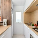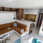 Para su mayor comodidad, la casa móvil también cuenta con dos cuartos de baño, lo que facilita el uso compartido y evita esperas. Las persianas enrollables en las habitaciones garantizan noches tranquilas y reparadoras, mientras que las puertas correderas aportan un toque de modernidad y elegancia al conjunto.