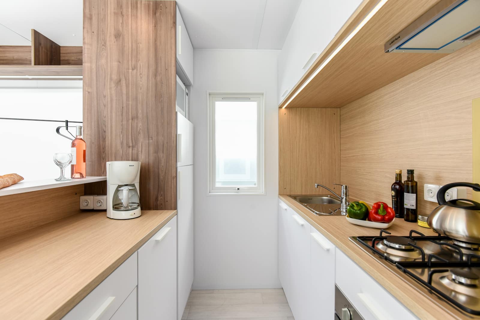 Para su mayor comodidad, la casa móvil también cuenta con dos cuartos de baño, lo que facilita el uso compartido y evita esperas. Las persianas enrollables en las habitaciones garantizan noches tranquilas y reparadoras, mientras que las puertas correderas aportan un toque de modernidad y elegancia al conjunto.