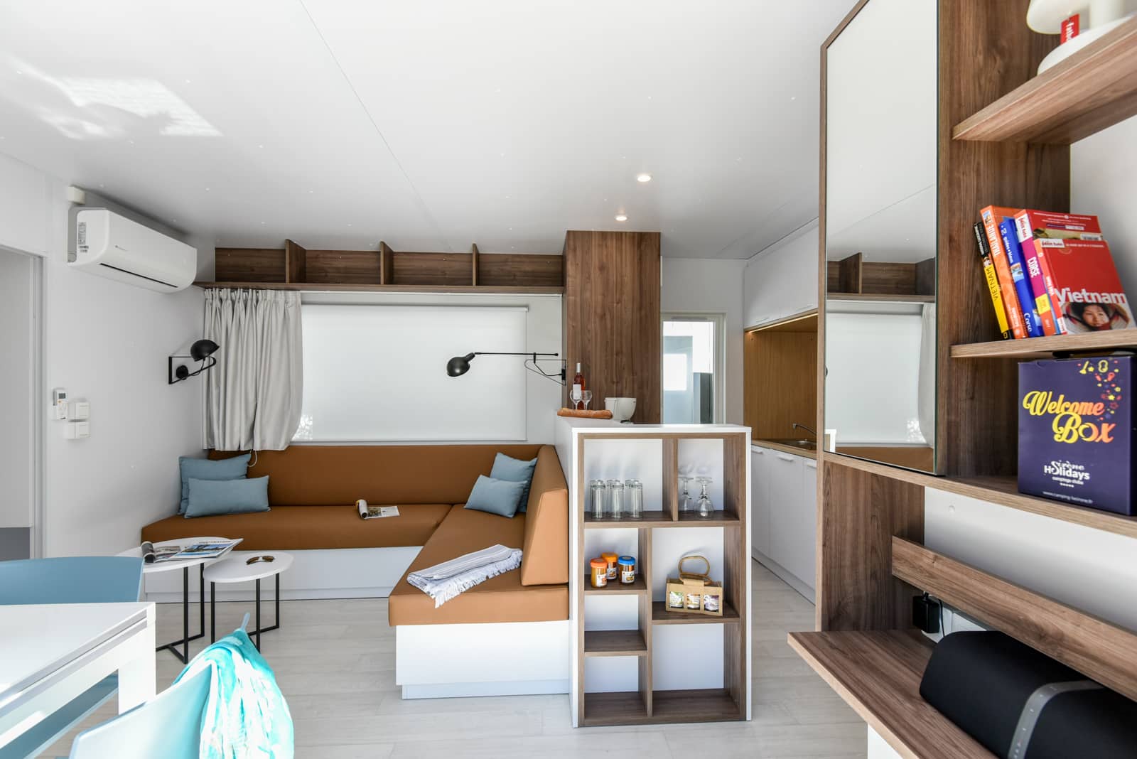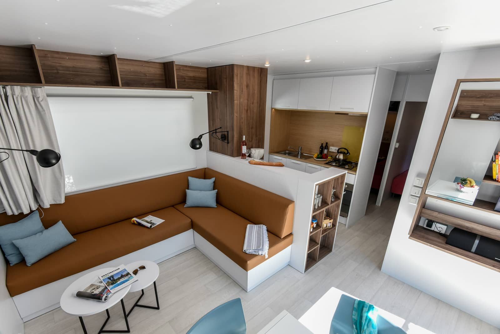 Al cruzar la puerta de entrada, quedará inmediatamente encantado con el excelente estado general de esta casa móvil. La cocina equipada le permitirá preparar deliciosas comidas para toda la familia, mientras que la sala de estar central con su banco ofrece un espacio acogedor para relajarse y disfrutar juntos.
